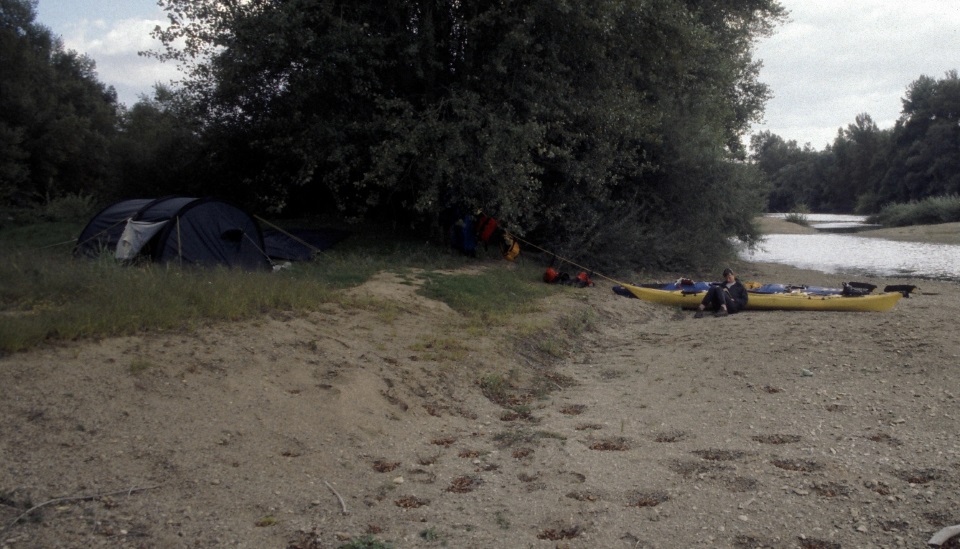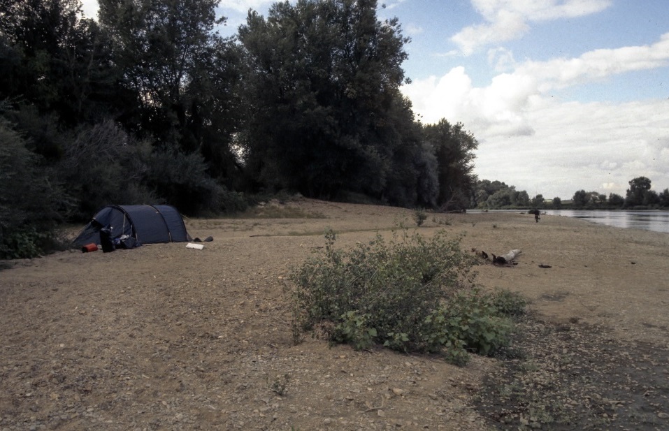 Dann bekamen wir ein bisschen Einblick in den französischen ‘Kantönligeist’ sprich Departementsgeist. Beim Tourist-Office ist natürlich Nichts und schon gar keine Karten für die folgenden Flussabschnitte zu bekommen. Schade eigentlich, da unsere (guten) Karten vom Gebiet Nievre leider bald enden. Nachdem wir losfuhren setzte bald wieder heftiger Regen ein. Auf den Karten sahen wir eine Ausstiegsstelle nahe Myenne auf der rechten Flussseite, die wir erkundeten. Der Platz war auch nicht so schlecht, eine Art Picknickplatz mit Bänken und Grill unter stabilen Bäumen, aber leider auch durchgehend grob geschottert, so dass Zelten nicht in Frage kam. Bald darauf fand Sibylle eine Stelle wo wir anlandeten und wir auch einen einigermassen geschützten Platz fanden. Diesmal wurde besonders gut besichtigt, da wir von Finnland schon Erfahrungen mit schlechtem Wetter hatten: Windschutz, Möglichkeit das Tarp gut abzuspannen und vor allem Keine Kuhle da wo das Zelt stehen sollte. Unter solchen Bedingungen ist der Adrenalinspiegel meistens etwas höher als üblich, was sich in einer Rekordzeit fürs Zeltaufstellen niederspiegelte. Es lockte schliesslich auch der warme Schlafsack und die Hoffnung auf etwas Warmes. Immerhin hatte gerade zu dieser Zeit der Regen aufgehört und es windete nur stark. Gekocht wurde ausserhalb des Zeltes, aber wir assen drinnen.