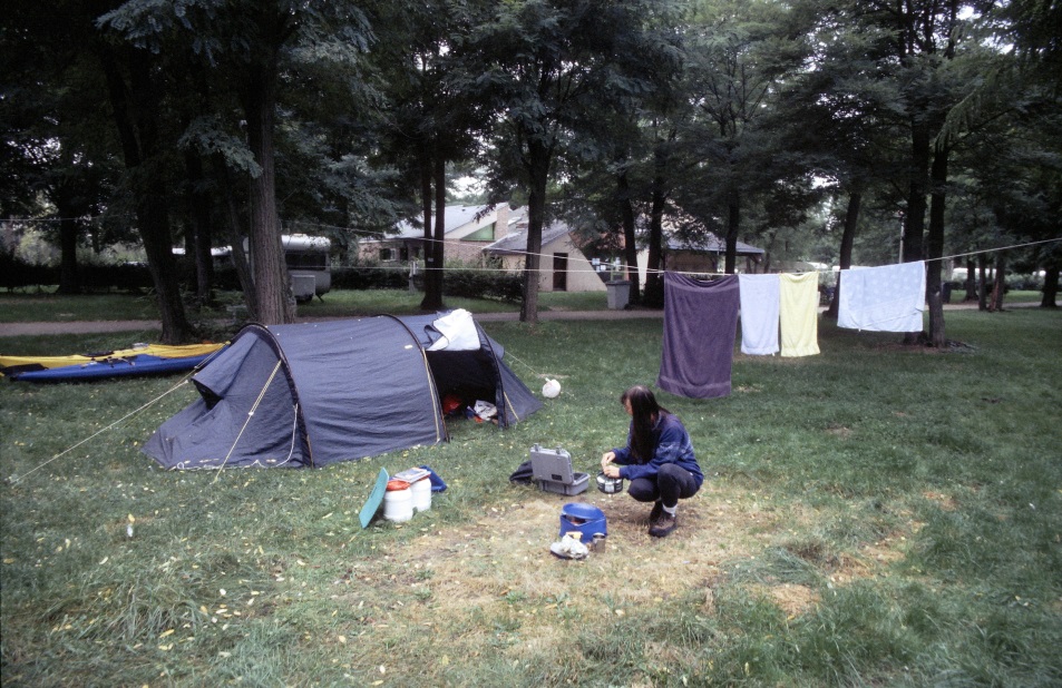 Wir landeten kurz an, fragten einen Fussgänger, wo denn der Campingplatz sei und wurden weiter den Fluss runter verwiesen. Auch dieser Camping ist nicht leicht für Kajakfahrer erreichbar. Es geht eine kurze Böschung hinauf über eine kleine Wiese, über die Strasse und schon ist man da :-). Naja wenigstens war hier jemand an der Anmeldung und - in einem Korb lagen ein paar süsse Stücke parat - na da konnten wir uns noch kurz stärken, bevor es daran ging das Lager aufzuschlagen. Wir holten die Kajaks auf den Campingplatz, weil es einfacher war mit dem Bootswagen das gesamte Kajak zu transportieren, als alle Einzelteile aus dem Kajak herauszukramen. Nachdem das Zelt aufgebaut war, ging es unter die Dusche - herrlich endlich wieder warmes Wasser zu spüren.