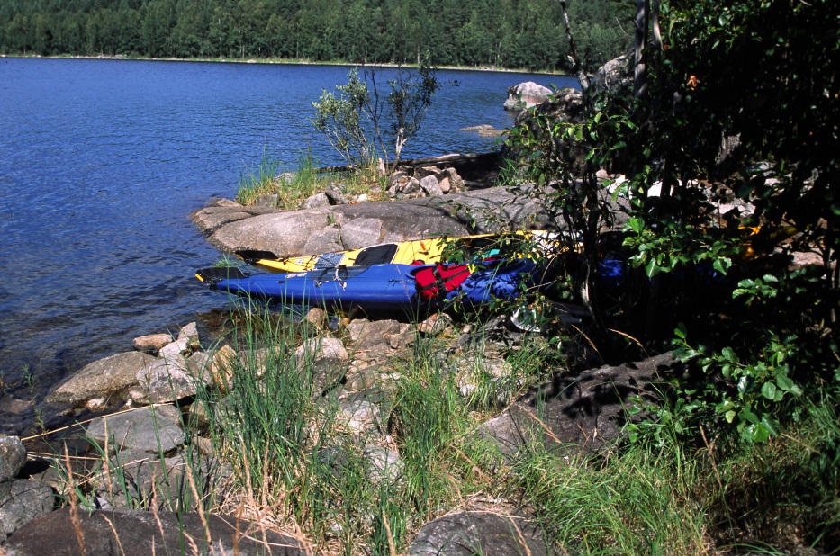 Heute geht es früh los, da wir praktisch wieder zum Ausgangspunkt fahren wollen. Gemütlich wird das ganze angegangen und unterwegs sehen wir, wie auch an den bisherigen Tagen, einige Paddler. Wir kommen auch an die Engstelle, die schon Diskussion ausgelöst hatte mit anderen, ob das befahrbar oder nicht sei. Es ist zwar flach und eng, aber durchaus befahrbar. Just hinter der Engstelle hat es einen schönen Biberbau. Wir fahren meist in Sichtentfernung zu einem ‘Doppelruderboot’, als ich auf einer offenen Wasserfläche eine Robbe entdecke - am hellichten Tag. Also ab in Ufernähe, die Kajaks ruhig halten und die Kamera hervorgeholt. Die Robbe bleibt als für Minuten unter Wasser und ist dann meist für ca. 30 Sekunden an der Oberfläche. Zwischendurch nästele ich das Tele auf die Kamera und Sibylle ‘jagt’ mit dem Fernglas. Ich hoffe, dass die Aufnahmen etwas werden. Irgendwann donnert dann ein Motorboot durch die ‘motorbootfreie’ Zone und das wars dann mit der Robbe. Wir paddeln weiter an eine Stelle an der es eigentlich Mökkis geben soll, und wir freuen uns schon auf Kaffee und Süssstückchen, aber es sieht dort nicht sooo einladend aus, und als dann ein Hund zu bellen anfängt, fahren wir zur nächsten Insel, schlagen uns ins Unterholz und machen Pause. Dann geht’s weiter und wir fahren den ersten Campingplatz Vaajasalo an. Dort liegt schon ein kleineres Kirchenboot und eine Grossfamilie planscht und grilliert herum. Die Plätze sind auch nicht überragend und so fahren wir zu dem am ersten Tag besichtigten Platz Lohilahti weiter. Dort hat einer seinen Kanadier fett am Steg geparkt, so dass wir dort nicht anlanden können. Beim Zeltaufbauen gibt es den Todestoss für mein altes Zelt : eine Gestänge bricht. Nach etlichen Mühen und etwas Beziehungsquerele kriegen wir das Zelt dann noch aufgebaut und machen Risotto ai Funghi zum Abendessen. Bislang hatten wir übrigens super Wetter, aber seit nachmittag hat es etwas zugemacht und es tröpfelt leicht. Ich spanne noch die Reste des Tarps übers Zelt.