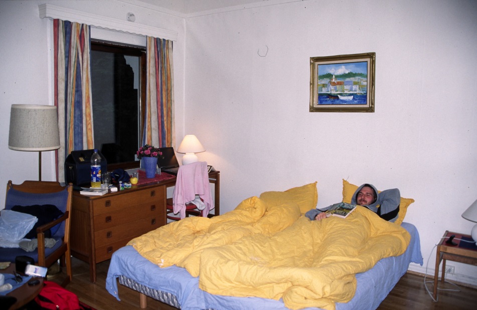 Um 17:00 Uhr betraten wir dann norwegischen Boden. Viel gemerkt hat man davon nicht, den obwohl das kein EU Land ist gabs keine Zollkontrolle. Das einzige was man gemerkt hat das man auf einen Brücke über einen Fjord fährt. Die Fahrt nach Oslo zog sich noch etwas hin da der Verkehr immer wieder stockte. Für die Autobahn mussten wir 15 Kronen Mautgebühr bezahlen. Als wir dann Richtung Oslo kamen mussten wir nochmals 15 Kronen Maut für die Innenstadt zahlen. Auf der Suche nach einem Hotel sind wir dann im Ostteil der Stadt stundenlang im Kreis gefahren, da wir keinen vernünftigen Stadtplan haben und ich ziemlich überfordert war. Dann haben wir in einem Nobelhotel, dessen Zimmer uns zu teuer waren, einen besseren Stadtplan bekommen, in dem auch die Hotels eingezeichnet sind. Das erste Hotel, das wir darauf aussuchten war uns auch noch zu teuer. Doch dann fanden wir eins das “Bed & Breakfeast” heisst und tatsächlich eine Art Pension in eine alten Villa ist. Das Zimmer ist richtig nett mit einem kleinen Balkon auf den Garten hinaus. Nach einer kurzen Erholungspause und checken der Formel 1 Resultaten (Schumi hat schon wieder gewonnen) wollten wir noch was essen. Der Einfachheit halber gingen wir in ein McDonalds Restaurant. Dann spazierten wir am Königs-Palast entlang zurück in “unsere Villa”.