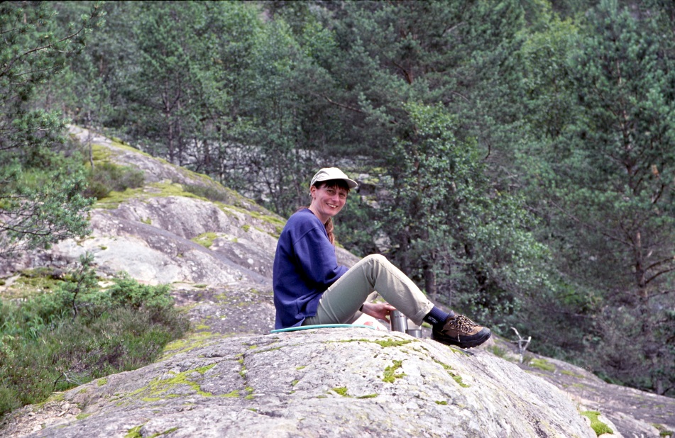 Das Wetter ist diesig und da wir schon Bekanntschaft mit den allgegenwärtigen Trollen in den Touristengeschäften geschlossen haben, wären wir inzwischen nicht mehr verwundert, wenn uns eins dieser Geschöpfe hier über den Weg liefe. Rechts und links des Weges erheben sich steile Wälder und ein leichter Nebel liegt über dem Boden. Gerade als wir wieder abwärts fahren, kurz vor Dalen, lichtet sich der Nebel etwas und wir sehen aus ca. 800 m auf den Talboden auf unser Ziel hinab. Im Norwegischen Campingprospekt ( bekommen bei der Touristeninfo in Oslo) hatten wir schon gelesen, dass es einen Camping in Dalen hat (nicht im ADAC) den wir ansteuern. Wir sind immer noch ‘Campingfaul’ und nehmen uns ein Zimmer im ‘Biberhaus’. Dies ist eine preisgünstige Alternative zwischen Camping und Hotel, und nachdem wir das Biberhaus mit der dortigen Küche, Essraum und Aufenthaltsraum besichtigt haben, sind wir absolut begeistert. Nach dem ersten Ausladen fahren wir noch schnell ins Dorf einkaufen (geschnetzeltes Schweinefleisch, Pilze, Milch…), lassen uns vom Verkäufer auch noch die Saucenpackunganleitung übersetzen (wer könnte das wohl im Coop ?) und sehen uns danach noch den Hafen an. Dann fahren wir in unser Biberhaus, kochen, spülen und gehen spazieren, spielen noch ein ‘Siedler’, schreiben den Tagesbericht und gehen dann ins Bett.