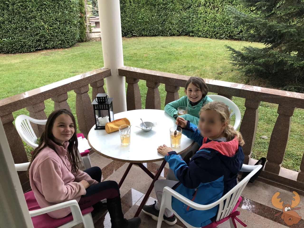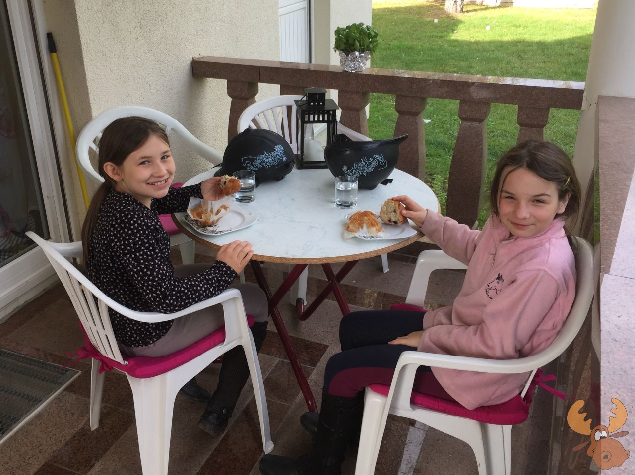 Heute hatten sie viel Spass, beide konnten frei gallopieren, am Nachmittag in der ganzen Abteilung. Wir waren zwischendurch einkaufen und einen Kaffee trinken, und als wir zurückkamen, waren die Mädels zwar fertig mit Reitstunde, aber noch lange nicht fertig mit Pony streicheln, helfen und spielen. Gegen Abend sassen sie dann mit einer Kollegin (Jule) auf der Terrasse und futterten Kekse und bekamen einen Punsch serviert.